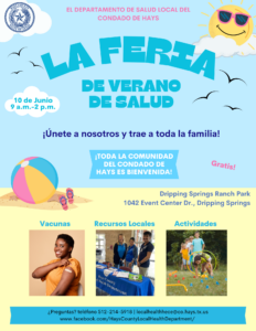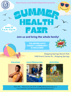 ¡Comience el verano junto a el Departamento de Salud Native del Condado de Hays! ¡Únase el 10 de junio de las 9 a.m. a 2 p.m. en Dripping Springs Ranch Park & Occasion Heart para acceder recursos locales, participar en actividades, y obtener las vacunas para la escuela! Manténganse atentos a más información en lo que se acerca el verano.