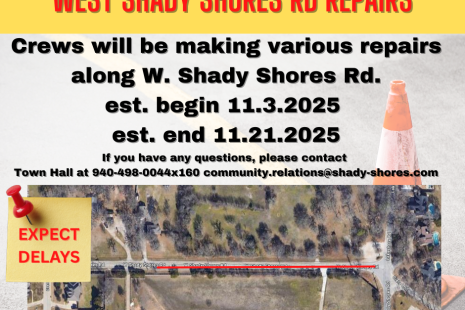 November 3, 2025 - November 21, 2025 2025-11-03T00:00:00 Monday-Friday 8:00 AM-5:00pm West Shady Shores Street Repairs Monday, November 3, 2025 West Shady Shores Rd Repairs- count on delays… Read More »Calendar • West Shady Shores Street Repairs